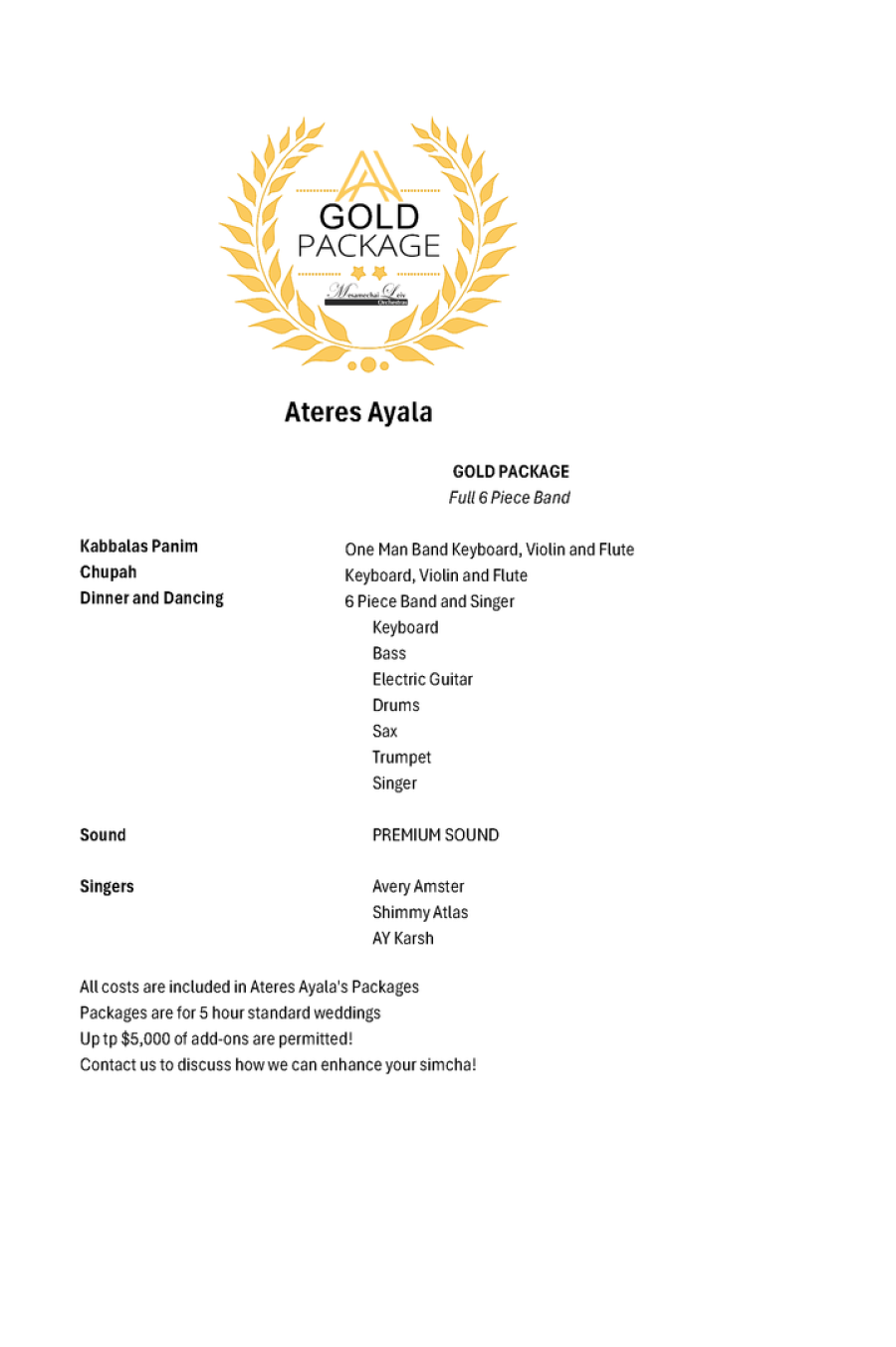 Mesamechai Leiv created the Gold Package to contain everything that you would need for your upscale wedding. As an added benefit, Ateres Ayala allows up to $5,000 in upgrades to the already exciting Gold package.