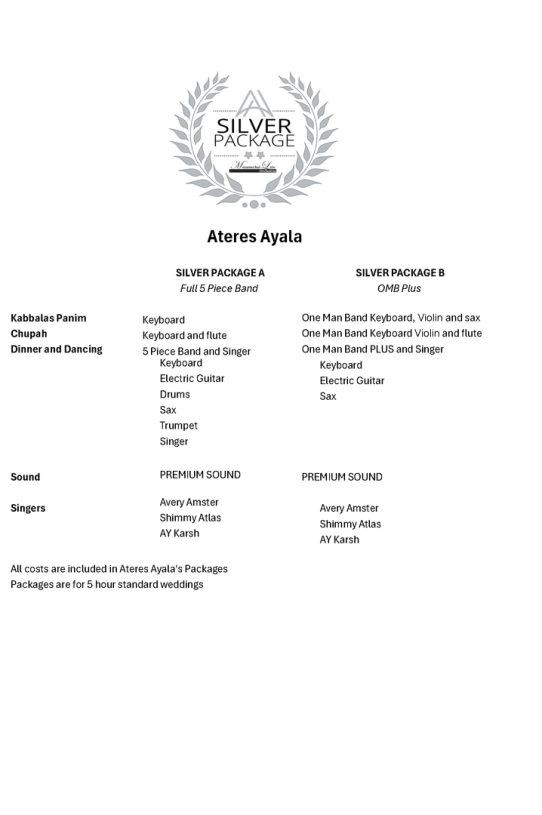 With Mesamechai Leiv Orchestras, nothing is left out. With Ateres Ayala's most discounted package, Mesamechai Leiv delivers your choice of a full 5 piece orchestra and singer or a One man band plus arrangement. Each package comes wilth full premium sound and a personalized song list.